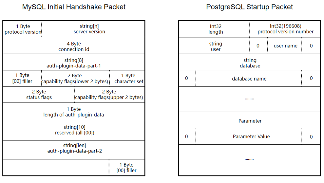 MySQL这边的初始化握手包是由服务端发送的,包含一系列的服务端参数,协议版本,数据库版本,线程ID,挑战随机数,服务器状态和字符编码等等,而PostgreSQL的启动包由客户端发出,主要包含的是协议版本,还有用户名与数据库名等等了客户端参数,PostgreSQL的服务端参数会在后面发送 Parameter Status 报文的时候,一个一个的发送到客户端。这是两者在启动和初始化上最大的区别。(PostgreSQL启动具体流程会放在文章最后)