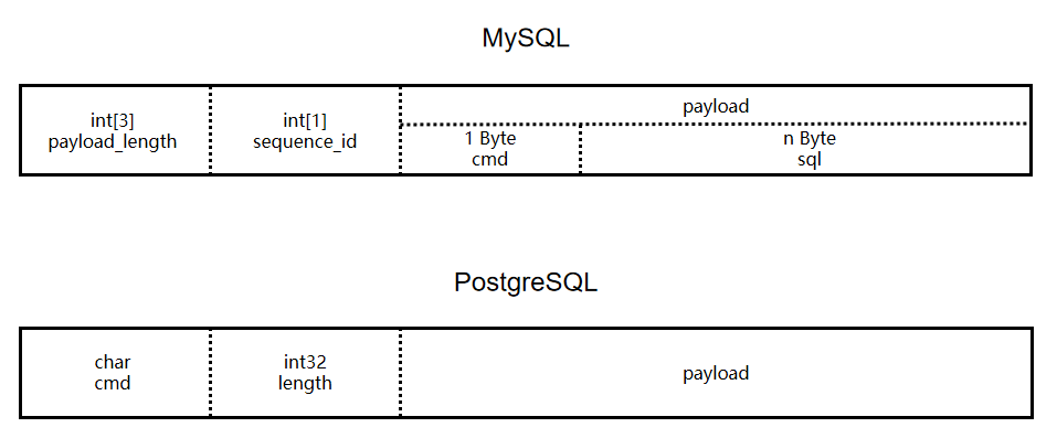 上图,可以非常直观的看出两者报文格式,其共同拥有的部位是报文长度,命令类型和具体命令的语句,除这以外MySQL会比PostgreSQL多一个序列号,然后比较直观的区别则是命令的长度和命令类型两者位置不同。